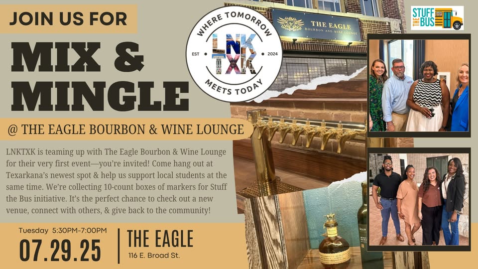 LNKTXK July Mix & Mingle @ The Eagle. 116 E Broad Street. Tuesday, July 29 | 5:30–7:00 PM. Join us for our July Mix & Mingle at The Eagle Bourbon & Wine Lounge—this will be the very first event hosted at this brand-new downtown spot! We’re also partnering with Texarkana Resources for Stuff the Bus. If you’d like to contribute, bring a 10-count box of markers to support local students—but donations are completely optional! No need to bring anything to attend.