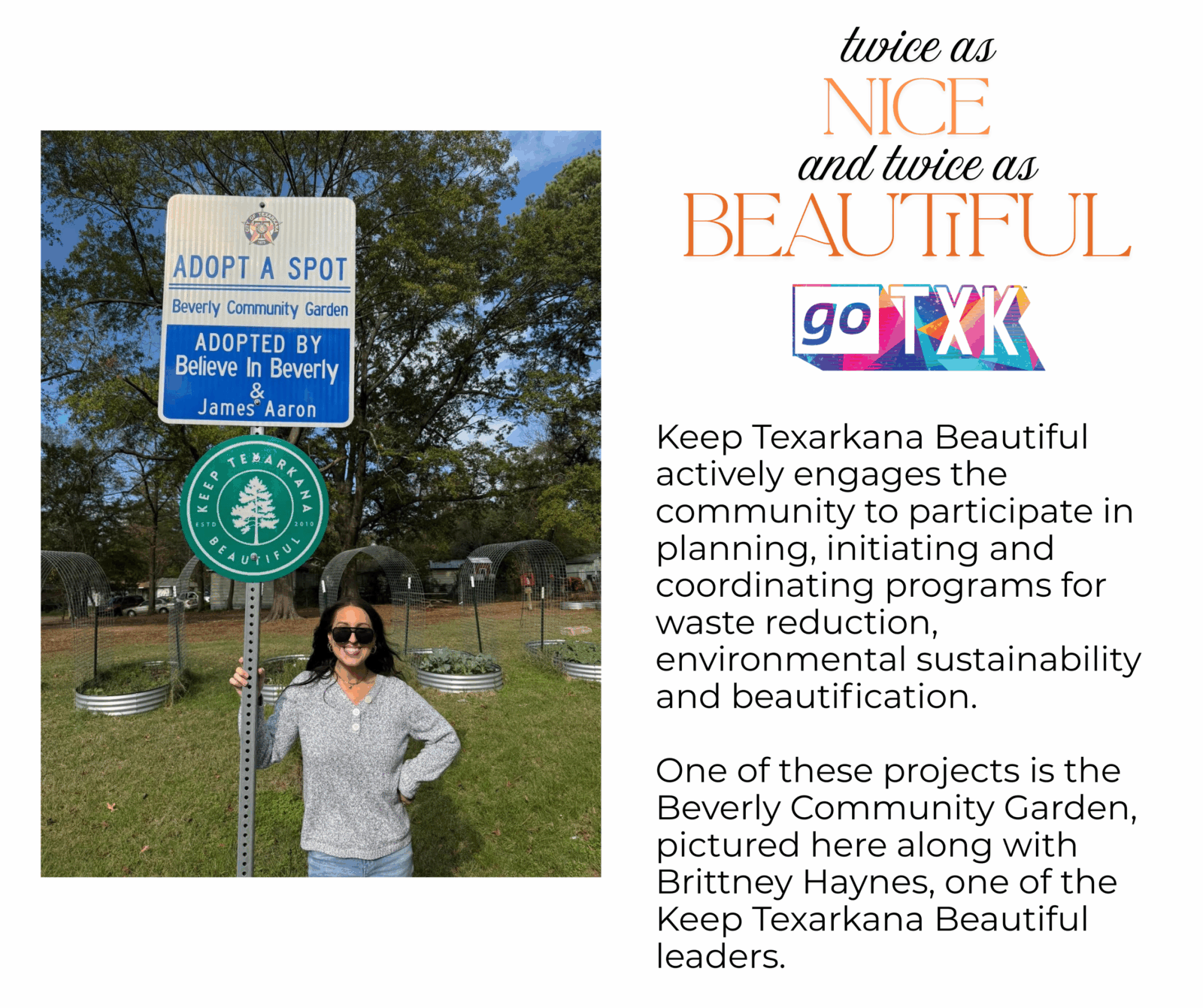 Keep Texarkana Beautiful actively engages the community to participate in planning, initiating and coordinating programs for waste reduction, environmental sustainability and beautification. One of these projects is the Beverly Community Garden, pictured here along with Brittney Haynes, one of the Keep Texarkana Beautiful leaders.