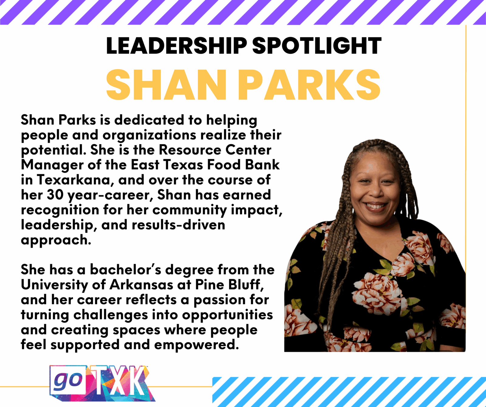 Shan Parks is dedicated to helping people and organizations realize their potential. She is the Resource Center Manager of the East Texas Food Bank in Texarkana, and over the course of her 30 year-career, Shan has earned recognition for her community impact, leadership, and results-driven approach. She has a bachelor’s degree from the University of Arkansas at Pine Bluff, and her career reflects a passion for turning challenges into opportunities and creating spaces where people feel supported and empowered.