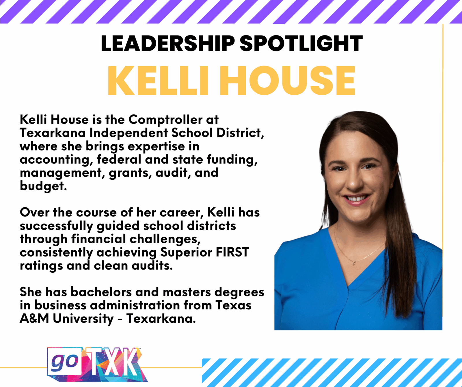 Kelli House is the Comptroller at Texarkana Independent School District, where she brings expertise in accounting, federal and state funding, management, grants, audit, and budget. Over the course of her career, Kelli has successfully guided school districts through financial challenges, consistently achieving Superior FIRST ratings and clean audits. She has bachelors and masters degrees in business administration from Texas A&M University – Texarkana.
