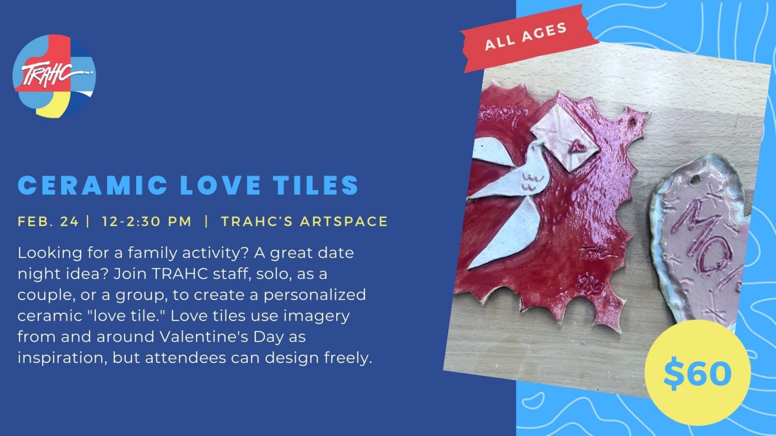 Looking for a family activity? A great date night idea? Join TRAHC staff, solo, as a couple, or a group, to create a personalized ceramic “love tile.” Love tiles use imagery from and around Valentine’s Day as inspiration, but attendees can design freely. Learn more!